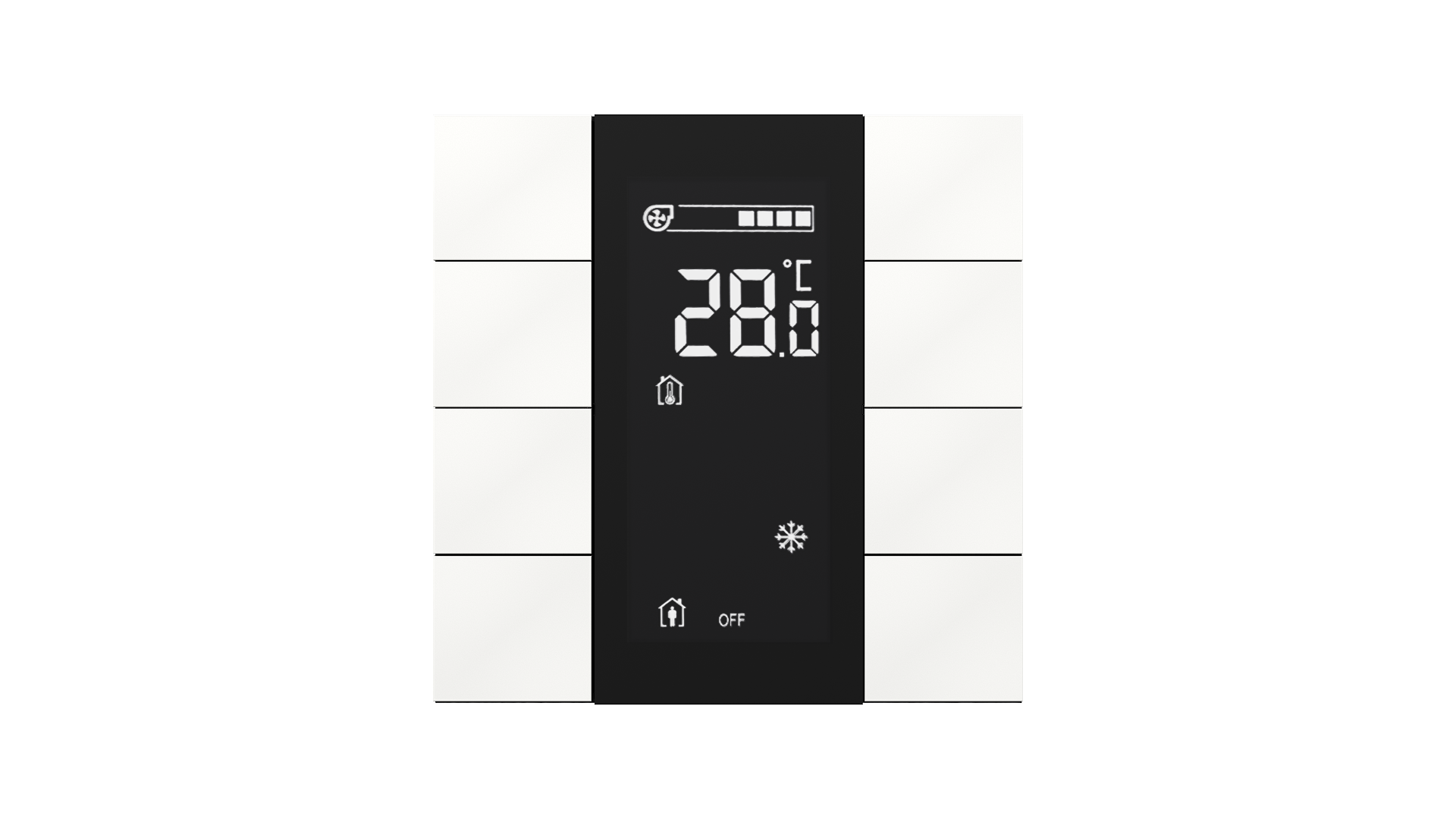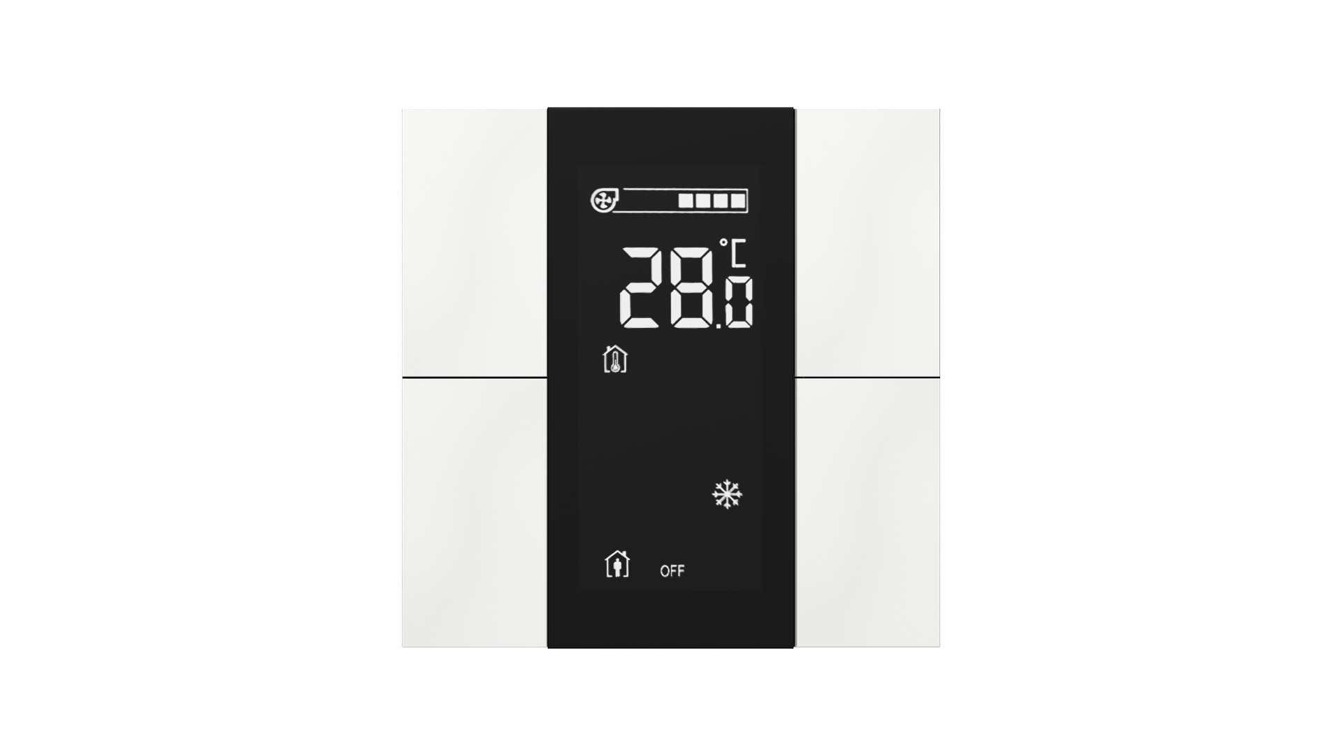 Interra iSwitch+ is a wall-mounting room controller device with an integrated temperature, humidity sensor, air quality and brightness sensor. The iSwitch+ can control heating and cooling operating modes with 2-points, Continuous and PWM thermostat functions. Each push-button is equipped with an RGB LED to show feedback or visualization and LCD models are equipped with VA-Display technology which provides low energy cost and good view angle. Moreover, there is blue navigation LED for orientation nightlight.