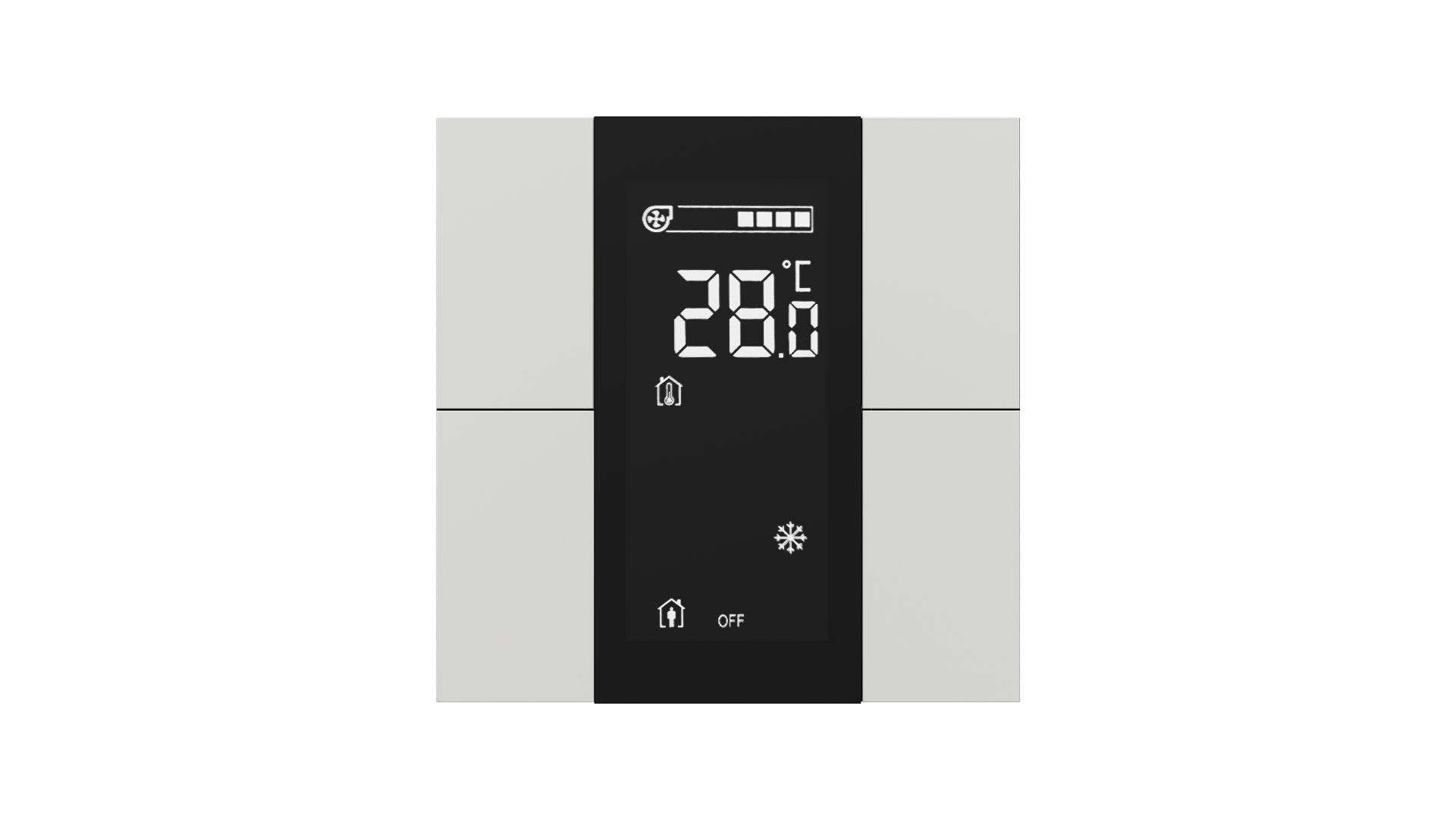 Interra iSwitch+ is a wall-mounting room controller device with an integrated temperature, humidity sensor, air quality and brightness sensor. The iSwitch+ can control heating and cooling operating modes with 2-points, Continuous and PWM thermostat functions. Each push-button is equipped with an RGB LED to show feedback or visualization and LCD models are equipped with VA-Display technology which provides low energy cost and good view angle. Moreover, there is blue navigation LED for orientation nightlight.