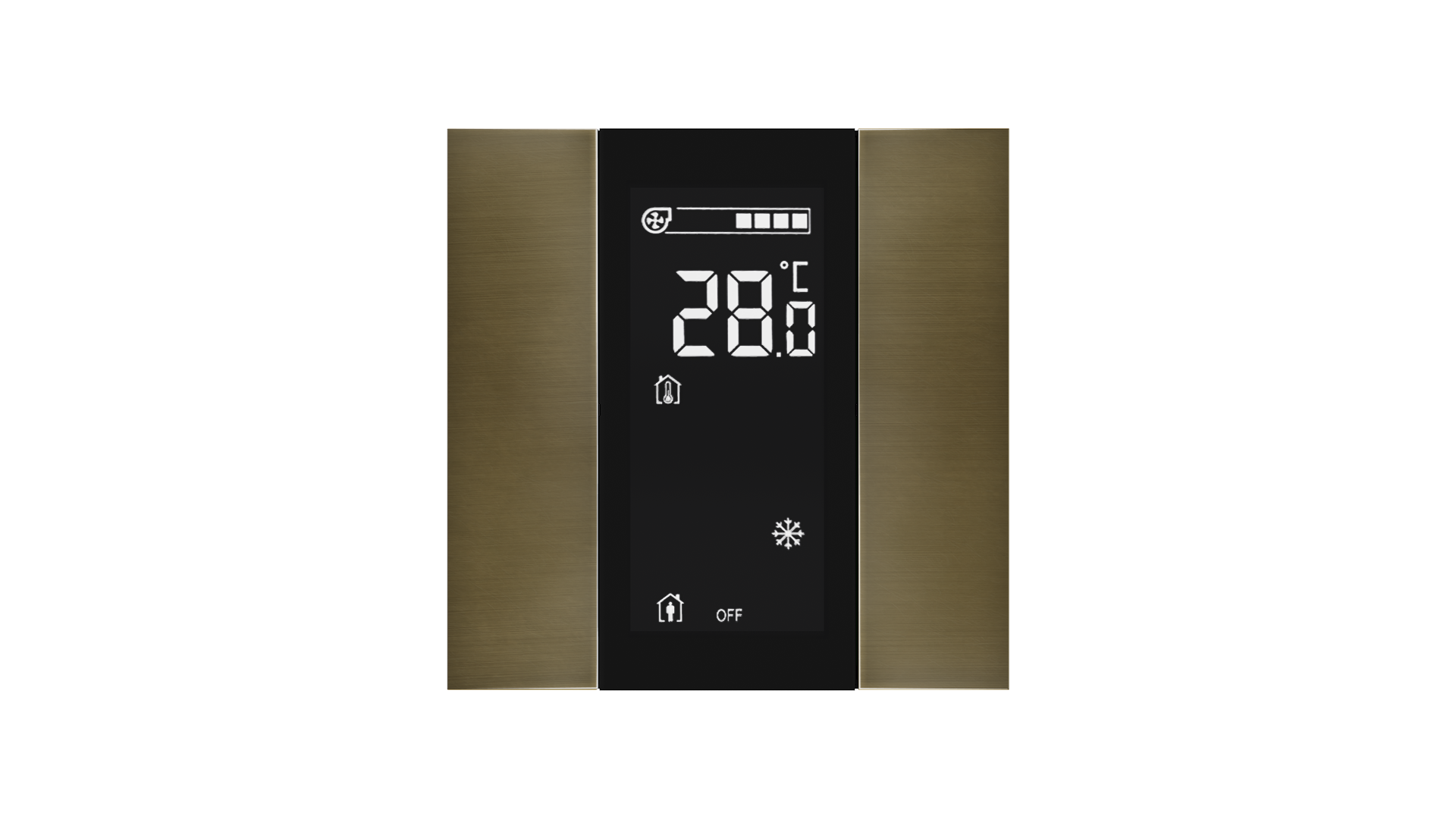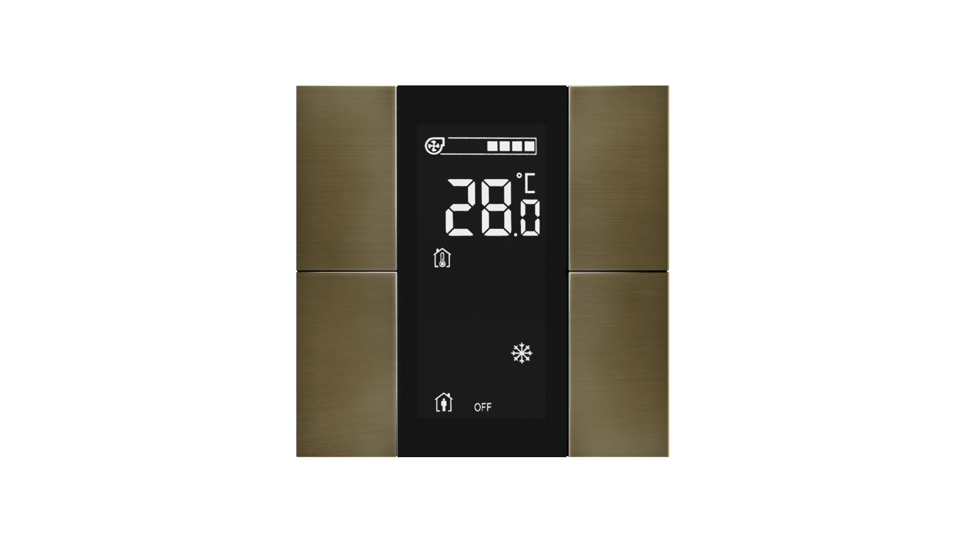 Interra iSwitch+ is a wall-mounting room controller device with an integrated temperature, humidity sensor, air quality and brightness sensor. The iSwitch+ can control heating and cooling operating modes with 2-points, Continuous and PWM thermostat functions. Each push-button is equipped with an RGB LED to show feedback or visualization and LCD models are equipped with VA-Display technology which provides low energy cost and good view angle. Moreover, there is blue navigation LED for orientation nightlight.