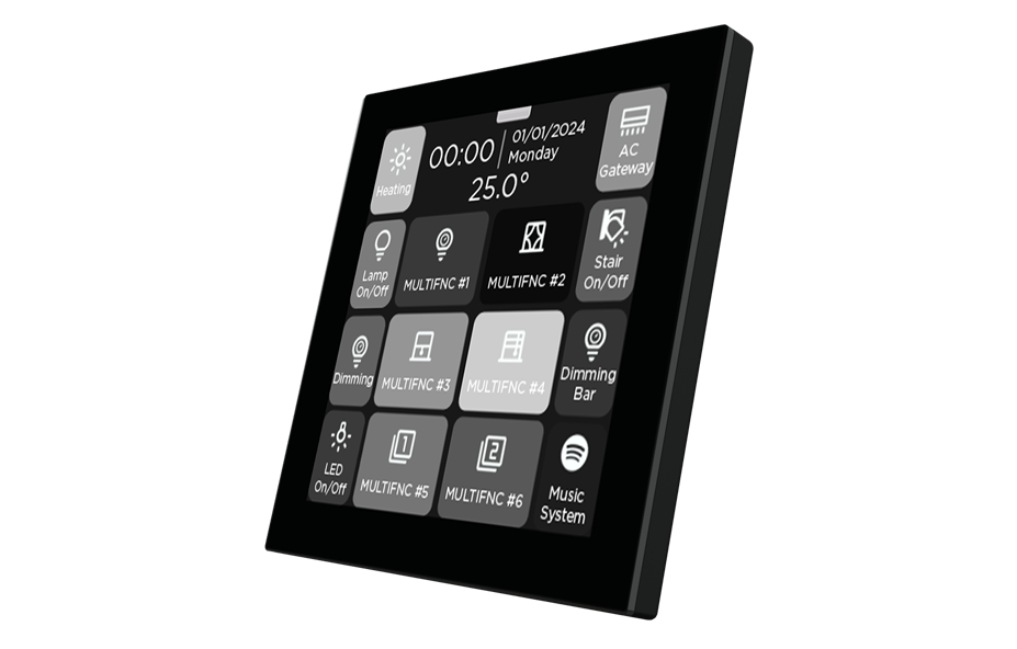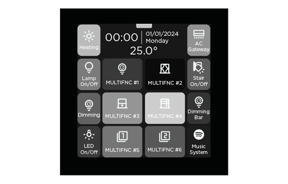 • Switching, toggle, dimming, shutter/blinds controls, predetermined scenes by users, value functions that can send presented values, 2 channels control functions, step switching, music control and thermostat extension features are available.